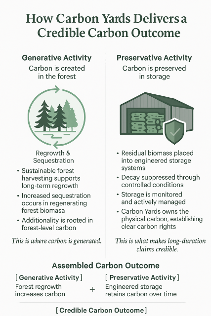 In the Carbon Yards system, this generative activity occurs in the forest. Sustainable forest harvesting supports ongoing regrowth, and regenerating stands sequester additional carbon over time relative to baseline management. By creating a durable outlet for residual material with limited economic value, Carbon Yards supports management regimes that maintain working forests, reduce disturbance risk, and promote regrowth. The additional carbon benefit arises from incremental sequestration in forest biomass over time, not from the handling of the harvested material itself. This framing aligns with emerging expectations that biomass-based removal must demonstrate real, landscape-level carbon gains grounded in observed practices.