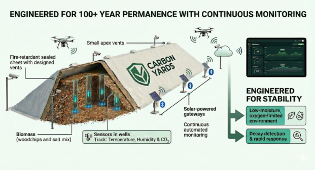Carbon Yards transforms a carbon pool that would otherwise cycle back into the atmosphere within years into a form of durable climate infrastructure. By integrating sustainable sourcing, treatment, engineered storage, and continuous monitoring, the system creates conditions under which biomass carbon can remain stored for generations.