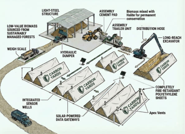 Carbon Yards is an engineered carbon storage system designed to preserve forest biomass under controlled above ground conditions. The system combines treatment, engineered storage, and continuous monitoring into an integrated operational framework designed for century scale carbon storage.